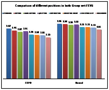 Effect of body positions on these parameters were analyzed using ANOVA. FEV1, FEV6 and PEFR attained the highest values in the standing position followed by sitting having slightly more value than ¾ sitting which in turn is much higher than long sitting followed by supine lying, side lying (Rt.) and side lying (Lt.). Lowest values were observed in head down position. Similar trends were observed in COPD and Normal subjects.