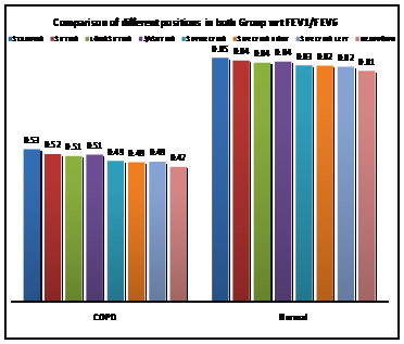 FEV1/FEV6 followed same trend for all the positions in the Normal subjects where as in COPD side lying (Lt.) showed slightly higher values than side lying (Rt.) while all the other positions followed the same fashion. A significant difference in the effect of different body positioning on Dynamic lung functions were observed in COPD and normal subjects. Improvement in dynamic lung functions in more upright positions is noticed in this study which may be due to the reason that in more upright positions gravity pulls the abdominal contents caudally within the abdominal cavity thus increasing the vertical diameter of thorax resulting in increased lung volumes and elastic recoil of lungs, while in recumbent positions the abdominal contents are higher in the abdominal cavity which may interfere with the motion of diaphragm resulting in lower lung volumes and flow rates.
