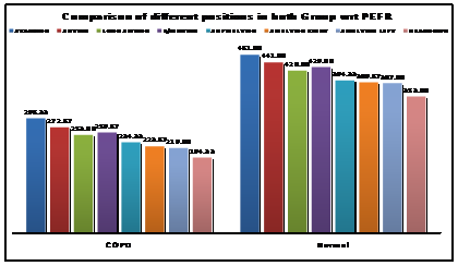 Methodology: Two groups consisting of 15 COPD and 15 normal subjects aged 40 to 65 years participated in the study. Their dynamic lung functions including FEV1, FEV6, FEV1/FEV6 and PEFR were measured in randomized order in different body positions i.e. standing, sitting, 3/4 sitting, long sitting, supine lying, sidelying right, sidelying left and headdown position.