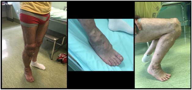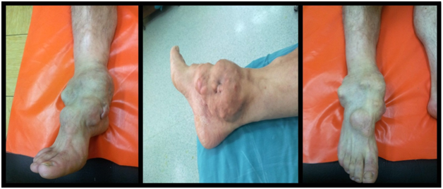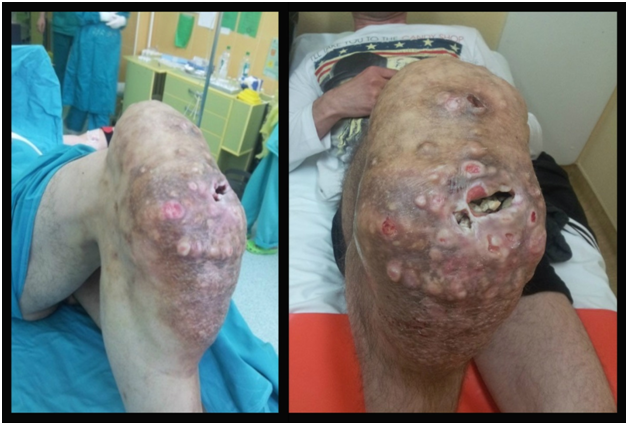 A 36 years old male came to Department for Orthopedic surgery for examination, because of big tumor of right knee (Figure 1) and ipsilateral ankle joint (Figure 2). These changes had been present for a few years. The first operation was done ten years earlier, when isolated anterior abdominal wall tumor was removed, along with urachus and right m. rectus abdominis, with abdomen wall plastic. Results of pathohistological analysis showed that it was Fibromatosis - Desmoid type - extra abdominal subtype. Five years after primary treatment of tumor mass of the anterior abdominal wall, patient observed new similar changes in the right knee and the ankle joint, which had been progressively increasing over the time. Clinical examination showed a large, foul smelling, tumor mass with ulcerations in anterior region of the knee (Figure 3) and tumor changes in the area of the ankle joint.