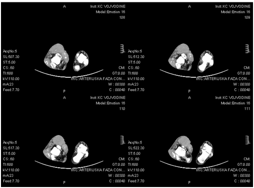 Patients with DT usually are young females between 15-35 years.11 Genetical predisposing plays an important role in development od DT, and is often associated with the familial adenomatous polyposis and Gradner’s syndrome. Other factors that influence formation of DT are chronic mechanical irritation and surgery induced scars and implants.4,12,13 Optimal management for DT has not be established, although surgery with radical resection with wide margins of the tumor remain the primary method of treatment. If surgery is contraindicated or not possible, alternatives are in the form of radiotherapy (RT),14 chemotherapy,15 hormone and anti-inflammatory therapy16 may be administered alone or as adjuvant surgical therapy. Because of the rarity of DT, high level evidence of healing does not exist. This article presents a case of large isolated extra- abdominal DT in middle aged male, localized on ipsilateral knee and ankle joint, which was successfully treated by a combination of surgical-limb salvage procedure, postoperative hormone and anti-inflammatory therapy with good final functional result without new tumor growth two years later.