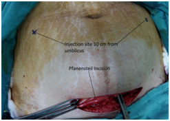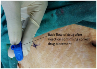 We describe a technique which can be used without the fear of complications in the blind landmark based approach. Our technique is as follows. Our landmark is at the level of umbilicus 8 to 10 cms from midline bilaterally (Figure 1). A tiny nick is made in the skin with a 18G sharp needle to obliterate the cushion effect (Figure 2). We then insert a 18 G Tuohy needle perpendicular to skin directing the needle slightly towards the ipsilateral anterior superior iliac spine just before the closure of peritonem. After feeling 2 pops of external and internal oblique aponeurosis the drug is injected after aspiration (Figure 4). Once the plane is reached the surgeon places his hand inside the abdominal cavity at the level of needle insertion to reconfirm needle placement (Figure 3). A bleb is palpated by the surgeon as the injection continues. The back flow of drug after injection is one of the signs that drug has been deposited in the TAP plane (Figure 5). The same procedure is repeated on the other side so a bilateral TAP block is performed.