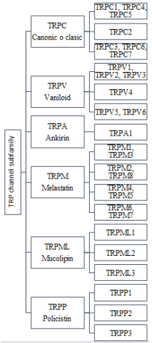 Figure 2 Superfamily of TRP channels expressed in humans. We observe in order the subfamilies that have been named based on their time of discovery, as is the case of TRPC channels and based on their main ligand, then the isoforms of each one are classified based on their structural homology.
