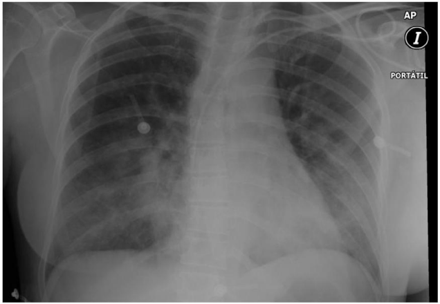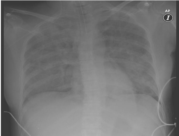 Approximately 500 cc of fluid was recovered through the ETT. Chest X-ray confirmed the diagnosis (Figure 1). Then she was moved to the ICU ward and sedation with Propofol 3 mg/kg/hr and Remifentanil 0, 5 mcg/kg/min were initiated. During treatment with PPV and PEEP, arterial pressured dropped to 80/50 and a dopamine infusion was initiated to keep MAP over 80 mmHg. 4 hours later, a second ABG showed improvement in the oxygenation and pH levels. Plasma electrolytes were: Na 144 mM, K 3, 0 mM, Cl 110 mM Ca++ 5.6 mg/dl. After a negative balance of 7 liters (Figures 2 and 3), respiratory parameters improved and she was extubated in the ICU 7 hours after the event. During the stay in the ICU she also presented dilutional anemia and coagulopathy that did not require transfusions (Hb 7, 4, Hct 26%, INR1.6; PT 44.7%, a PTT, 35 s.) She was discharged from the hospital 7 days later without any serious or irreversible neurological damage of any type.