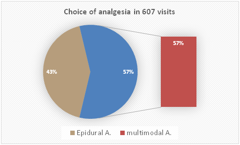 79 of the 607 patient entries with a visual numerical scale equal to or greater than 4 at rest, which gives a result of 13% (Figure 4). 174 of the 607 patient entries presented a visual numerical scale equal or greater than 4 in movement, which gives a result of 28% (Figure 5). Type of postoperative analgesia (Figure 6). The opioid most commonly used in intravenous analgesia was buprenorphine with 77% (270 visits) Intestinal activity according to type of postoperative analgesia (Table 1). Satisfaction was very satisfied in most patients (Figure 7).