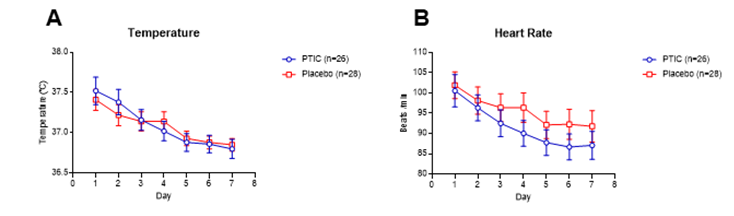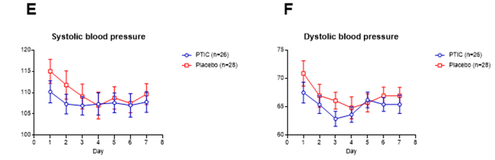 No differences in temperature, respiratory and heart rates, systolic and diastolic blood pressure were sound at baseline vs. every day of treatment of PTIC or placebo or between groups of treatment (Figure 1A, B, C, E, and F).