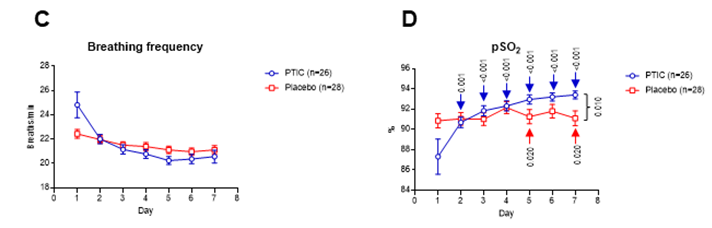 At baseline, mean oxygen saturation readings were 89.1 ± 6.9 (range: 60 – 98; Figure 1D). At day 1 post-treatment, mean oxygen saturation readings were 93.2 ± 2.04 (range: 90 - 98; P<0.001; Figure 1D) and 91.1 ± 3.9 (range: 80 – 98; Figure 1D); and the percentage of subjects with oxygen saturation readings ≥92% were 89.0% and 53.6%, for PTIC and placebo respectively (P=0.010; Figure 1D). The first statistically significant increase of oxygen saturation readings (Figure 1D) in PTIC was determined on day 2 of treatment. The PTIC significantly increases the odds ratio 5.750 times to reach the endpoint compared with placebo (P=0.024).