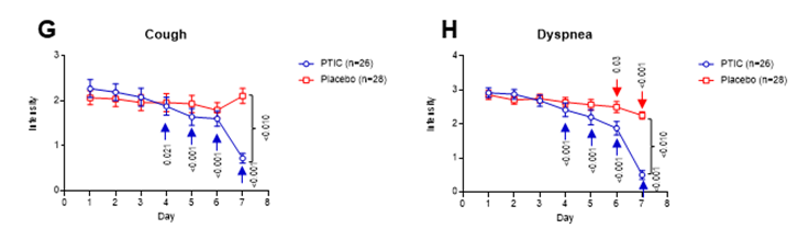 Symptom improvement was evaluated every day and compared with baseline. Cough, dyspnea, and chest pain decreased at statistically significant levels during day 4 of PTIC treatment (Figure 1G, H, and I).