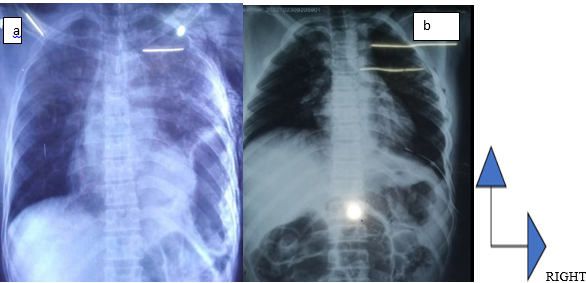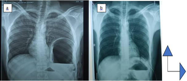 An 18-year-old patient with no known pathological history, was admitted to the emergency room for multiple trauma associating: closed thoraco-abdominal trauma, firm trauma of the left arm and a closed trauma of the contralateral leg. On admission, he was conscious, well-oriented in time and space with Glasgow 15/15. The patient was noted to be unstable in terms of hemodynamics (BP = 90/60 mm Hg and HR = 124 beats / minute) and ventilation (FR = 32 cycles / minute and spo2 = 88 % in room air). There were also dermabrasions on the left hemithorax and opposite the left hypochondrium, asymmetry of the thorax, and decreased amplification of the left thorax. On auscultation, vesicular murmurs were absent in the left pulmonary field replaced by hydro-aeric sounds. On abdominal examination, the abdomen is soft and painless to palpation and hydro-aeric sounds are heard on abdominal auscultation. Examination of the musculoskeletal system reveals a fracture syndrome of the left arm and a fracture syndrome of the right leg. The frontal chest X-ray had objectified a hydro-aeric image occupying the left hemi-thorax and pushing the diaphragmatic dome upwards. The mediastinal structures were pushed towards the contralateral side. The X-ray of the left arm had objectified a closed fracture of the humerus and the X-ray of the right leg objectified a closed fracture of both legs. The chest CT scan was not performed. The biological assessment was unremarkable. We performed surgical exploration by supra-umbilical median laparotomy. The exploration found a 7 cm rupture of the fleshy portion of the left diaphragmatic dome and abdominal viscera (greater omentum, stomach). We proceeded to reintegrate the organs with a suture of the diaphragmatic defect by separated stitches with non-resorbable thread 0. Osteosynthesis was performed at a later time for limb fractures. The postoperative course was simple. Chest X-ray on postoperative day 2 showed the disappearance of the initial lesions (Figure 3b). The chest drain was removed on postoperative day 4. The patient was discharged from the hospital on postoperative day 5. After 6 months, no complaints were reported by the patient.
