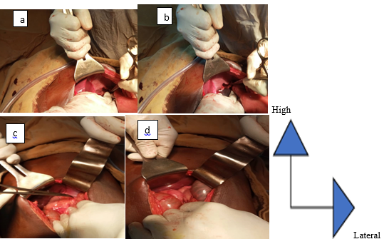 Figure 2 Intraoperative image showing the left diaphragmatic defect (a and b after reduction of the herniated viscera, c and d before reduction of the herniated viscera).