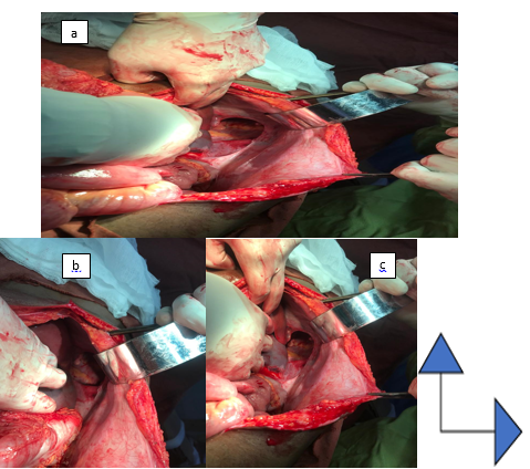 This was a 55-year-old patient, with no known pathological history, admitted to the emergency room for thoraco-abdominal trauma following a road accident. On clinical examination, the patient was conscious with good general condition. He was hemodynamically stable. Dyspnea was noted with a respiratory rate of 27 cycles/min, and oxygen saturation (SPO2) was 92% on room air. Dermabrasions were noted on the left hemithorax, asymmetry of the thorax and a decrease in the expansion of the left thorax. Auscultation found an abolition of vesicular murmurs in the left pulmonary field with a perception of hydro-aeric sounds. On abdominal examination, the abdomen was soft and painless. Hydro-aeric sounds perceived on abdominal auscultation. On additional examinations; an Emergency chest X-ray showed effacement of the left diaphragmatic dome, with passage of intra-abdominal viscera into the thorax strongly suggesting a diaphragmatic rupture. The left lung was pushed up and to the right (Figure 1). The thoraco-abdominal CT scan was requested but not performed. The biological assessment (hemogram, azotemia and creatinine) was normal. The patient was blood group O rhesus positive. We considered the diagnosis of a traumatic rupture of the diaphragm with repercussions on the ventilatory function and we indicated surgical management. Under general anesthesia, the approach was made via the left subcostal abdominal route. Exploration revealed the presence of the stomach and spleen ascended into the left hemithorax through a 4 cm diaphragmatic breach (Figure 2). The placement of a gastric tube allowed the stomach to be emptied and respiratory function to be improved. A lowering of the stomach and spleen ascended intra-abdominally is performed. The placement of chest drains preceded the diaphragmatic suturing by interrupted stitches with non-absorbable thread and the placement of a chest drain opposite the suture. The postoperative course was simple with the removal of the drain on day 5. The patient was discharged from the hospital on day 7 postoperatively in good health. Over a 6-month follow-up, no complaints were reported by the patient who had resumed his daily activities.