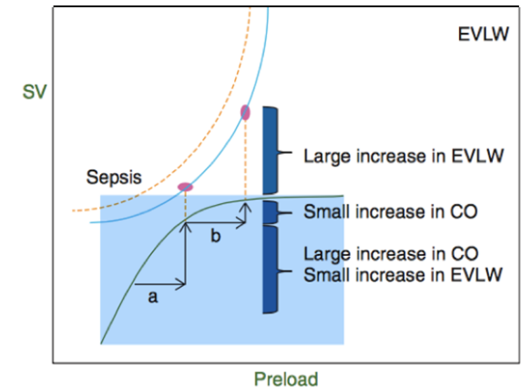 Figure 1 Combined Frank-Starling and Marik-Phillips curves demonstrating the physiology of fluid responsiveness and how over-hydration produces detrimental effects. The Frank-Starling curve (curve within the blue region) shows a steep portion (a) and a plateau portion (b). The steep portion shows a region of fluid responsiveness. As preload increases, there is also a large increase in stroke volume [SV] (or cardiac output [CO]). The plateau portion represents a region of less fluid responsiveness. In this region, further increases in preload no longer produce a large increase in SV.5 The Marik-Phillips curve (curve above) demonstrates that as patients become less fluid responsive, extravascular lung water (EVLW) and tissue edema can markedly increase because the increased cardiac filling pressures causes transmission of hydrostatic pressures.15 This process is emphasized in patients with endothelial damage such as those with sepsis, ARDS and burns.16,17