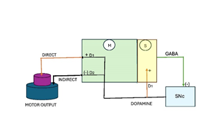 (Three compartmental models of basal ganglia circuit. Sriosomes (S) give inhibitory projections to substantia nigra pars compacta (SNc) via gamma - aminobutyric acid (GABA) receptors. Output from SNc gives feedback into the matrix (M) via dopamine. Matrix carries direct excitatory motor outputs via dopamine 1 (D1) receptors and indirect inhibitory motor output via dopamine 2 (D2) receptors.)