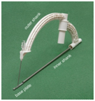 The new invention, SafeTrach, addresses all these problems. This device has an inner and an outer shank that, when combined functions like a tweezers (Figure 1-4). The inner shank is introduced through the orotracheal tube and when the outer shank has been connected to the inner shank the puncture needle will be guided to a correct puncture.3,4
