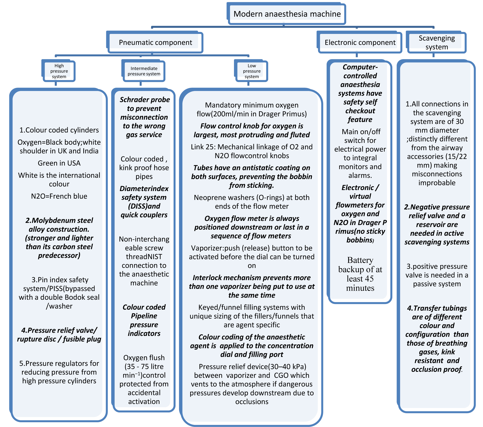 These are classified into the pneumatic, electronic and scavenging components. When we equate it to the history of anaesthesia, the “pneumatic system” represents the “Old Stone Age”, the “electronic system” marks progress to the “New Stone Age” and the “scavenging system” has ushered in the “Iron Age”. With advancements in perioperative care, there is tremendous improvement in anaesthetic tools with the passage of time and hence, the list of safety features is also rapidly expanding. Chalking down of international safety specifications has resulted in standardization of features between different brands of workstations. The standard safety features in a modern anaesthetic machine have been summarized below (Figure 1).1–4