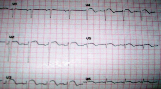 Figure 1 ECG of the patient showing ST elevation in anterolateral leads with a prolonged QT segment.
