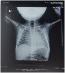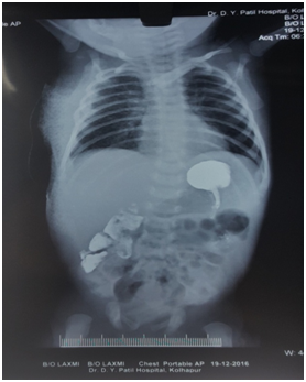 An 1 day old neonate of 36 week gestational age and 2700 gm weight was delivered at DY Patil Hospital, Kolhapur. After birth, baby had excessive frothing with respiratory distress so he was admitted to NICU with the clinical findings of heart rate 146/min, RR 50/min with intercostal / subcostal in drawing and SpO2 on air was 99%. Patient was managed with oxygen, nebulization, antibiotics. X-ray chest and abdomen showed rolling up of nasogastric tube (NGT) in upper part of esophagus and large gas shadow of stomach (Figure 1). The ECG and ECHO were normal. Routine blood investigations and ABG were within normal limits. Patient was diagnosed as a case of tracheoesophageal fistula type IIIB. High risk consent taken after the parents were informed about the risk involved and about the need of postoperative intensive care. PCV was arranged.
