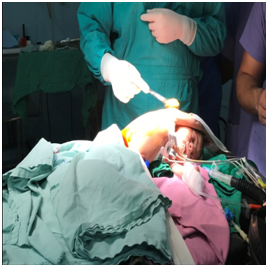 He was placed in lateral position and bilateral air entry reconfirmed (Figure 2). Under aseptic precautions, 18 G epidural catheter with bacterial filter was placed in the caudal space and advanced upto15cm to reach T4 level as measured from the caudal space and then fixed. Inj. ropivacaine 0.2% in the dose of 0.5 mg/kg was given epidurally, followed by top ups one hourly introperatively. Surgery was performed through right thoracotomy in 4th intercostals space. The TEF was exposed, ligated and end to end anastomosis of the esophagus was done after mobilization. Surgery lasted for two hours. Intraoperatively, 70 ml of ringer lactate /hour was infused. Heart rate was maintained between 100-120/min. SpO2, ECG and urine output were continuously monitored. Blood loss was approximately 35ml (15%) replaced with ringer’s lactate solution in the ratio of 1:3 over 2hrs. Intercostal chest drain was placed and column movement was seen.