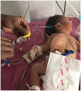 Preoperatively baby was kept in upright position and managed with NG tube for aspiration of excessive secretions two hourly and vital monitoring. After stabilization and preoperative evaluation patient was accepted for surgical repair of TEF under ASA-III risk consent. GA along with caudal epidural catheterization was planned for surgery. Preoperatively adequate hydration achieved with ringer’s lactate solution as 100 ml/kg/24 hours.