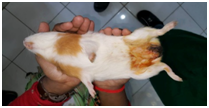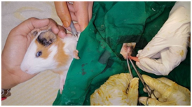 On January 11-2016, Two male English variety (short haired) guinea pig weighing 650gms and 400gms aged about 6 months was presented to the SAQ Teaching Veterinary Hospital, Chittagong Veterinary and Animal Sciences University (CVASU), Chittagong, Bangladesh, for castration. Both guinea pigs were active and alert. On clinico-andrological examination, both descended testes were found to be intact. The vital parameters viz., temperature, respiration rate and heart rate were recorded as 100°F, 56/min and 236 beats/minute respectively (Figure 1 & 2).