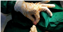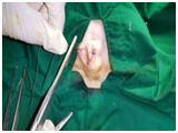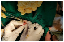 The surgical area was scrubbed with 7.5% povidone iodine solution. This was repeated for 3 times times. Later, when the pet was shifted to the operation theatre the area was again sterilized with 7.5% surgical povidone iodine solution and surgical spirit alternatively twice. Both the testes were manipulated from within the peritoneal cavity, through the inguinal ring and held tightly within the scrotum by fingers. An incision of one cm tip of the testis through the scrotal skin (Figure 5 & 6).