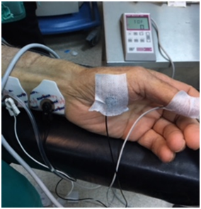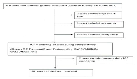 All cases no given pre-medication. Routine hemodynamic and TOF monitoring was applied to patients transferred to the operating room. During the operation, systolic and diastolic blood pressures, heart rate, peripheral oxygen saturation, adductor muscle temperature and nasal temperature were monitored. Neuromuscular conductance was monitored using TOF-WATCH® SX (Organon, Dublin, Ireland) device. Figure 1 shows the TOF device used. The skin was cleaned with alcohol-soaked cotton and left to dry and then the distal electrode (Neotrode ® Neonatal ECG Electrode, USA) was placed on the volar side of the wrist close to the trace of ulnar artery, 1 cm above the wrist joint, over the ulnar nerve. The proximal electrode was placed 2-3 cm proximal to the distal electrode. Acceleration transducer was mounted on the thumb and was fixated to the operating table with a plaster to allow free movement of the thumb. Temperature probe was fixated to the thenar region of the hand with a plaster. Patients were covered with attention given not to allow thenar region temperature drop below 32°C. Ambient temperature in the operating room was adjusted at 21-23°C. An intravenous line was placed and fluid replacement was initiated (Ringer lactate, 10ml/kg/hour). All fluids given to the patients were brought to room temperature. All patients received pre-oxygenation with 100% oxygen. Induction anesthesia was performed with intravenous (i.v.) administration of propofol 2mg/kg (Propofol® 1% Fresenius Kabi), fentanyl 1 mcg/kg (Fentanyl citrate® 2ml/100 mcg) and 1 mg/kg lidocaine (Aritmal 2% OselIlaç Turkey). When the eyelash reflex disappeared, calibration was performed with peripheral nerve stimulator. Consequently, three control single twitch (0.1Hz) values were obtained after 1 minute of waiting. Then, 3 control TOF values were obtained. Afterwards, rocuronium (Esmeron® 50mg/5 ml N.V. Organon, Oss, Netherlands) 0.6 mg/kg was administered. The interval between rocuronium administration to TOF0, zero TOF value, was recorded. Patients were intubated when TOF value was zero. In all patients, maintenance of anesthesia was provided with 50/50% O2-N2O and 2% sevoflurane. During the surgery, when TOF value reached 25%, additional rocuronium with 1/4 of the intubation dose was administered and the time was recorded as TOF25. For all patients, total rocuronium dose was recorded. At the end of the surgical procedure, TOF value was recorded as TOF end. Surgical time was recorded as the interval from initiation of surgical incision until the last suture at the end of the operation. In case TOF value at the end of the operation did not reach 25%, additional time was given to reach 25%. After the end of the surgery, when TOF value was 25%, sugammadex 2 mg/kg was administered i.v to reverse the non-depolarizing blockade. The time required to achieve a TOF rate from 25% to 90% following sugammadex administration was recorded as TOF25-90. Once TOF value reached 90%, sevoflurane inhaler gas was shut down. Patients were extubated when respiratory rate was >8/min, EtCO2 value was <50mmHg, SpO2 value was >90% and adequate tidal volume was established. The interval between TOF90 value and extubation of patients was defined as extubation time. Following extubation, patients were transferred to postoperative care unit (=PACU) once their overall condition was stabilized. For monitoring postoperative curarization (=PORC) in PACU, patients were assessed with head-raise and tongue stick out tests every three minutes for a total of 30 minutes. After admission to PACU, patients were monitored for at least 30 minutes and those who did not show PORC and had Aldrete scores ≥9 were transferred to the ward. The intraoperative fluid requirement was calculated based on ideal body weight, extent of surgical area and fasting times and fluid replacement was administered accordingly. Patients were allowed to drink water or liquids until 2 hours prior to operation with consideration of preoperative fasting duration. Preoperative biochemical tests were analyzed one day before the operation, whereas postoperative biochemical tests were analyzed 24 hours after the operation. Some of the cases were hospitalized 48 hours postoperatively and others were admitted for 24 hours. Therefore, control biochemistry values of all cases were taken after 24 hours. Since no invasive procedure was performed, no renal biopsy was performed. The flow chart of our work is shown in Figure 2.