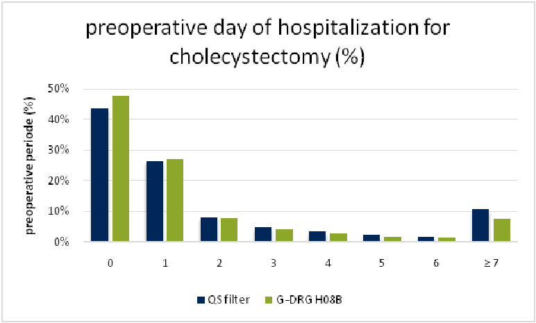 Calculation basis was the article 21 KHEntgG record of all surgical procedures. Each hospital is obliged to deliver annually their anonymized inpatient procedure data to the respective official institution - the Institute for the Payment System in Hospitals (InEK). InEK is responsible for the calculation of the DRG reimbursement rates (relative values), the billing of German inpatient health care delivery is based on. Those procedural data are pooled and the results are made available in the annually updated DRG-Report browser. Another source of information are the data of the so called external quality assurance (annual quality reports mandatorily prepared by each hospital) which are reviewed and evaluated by the IQTIG (Institute for Quality Assurance and Transparency in Healthcare formerly conducted by Institute for Applied Quality Improvement and Research in Health Care (AQUA)). Unfortunately, the publicly available data of article 21 KHEntgG allow no assertion on the period between admittance and begin of surgery. The results of the IQTIG reviews at least give a notion on the average preoperative period of hospitalization for certain procedures (including cholecystectomy). In order to calculate possible financial savings additional data of a group of hospital benchmarking hospitals was consulted. This data set contains detailed information on the date of admittance and the moment of the surgical procedure.