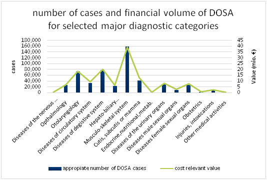 For an initial estimation for other procedures eligible for DOSA the following very careful and defensive approach was chosen: Incorporated were only procedures with operative codes relevant for grouping in the contract for ambulatory surgeries according to article §115b SGB V. The corresponding DRG were evaluated under the same assumptions as depicted above. And: Only 34.2% of the overall number of DRG were marked DOSA relevant. The overall analysis (sorted by major diagnostic categories) results in a DOSA potential of 510,774 cases per year. One day of assumed reduction of preoperative hospitalization period therefore would already lead to a potential reduction of 1,399 hospital beds and financial annual savings of approx. 138 million Euro (Figure 2).
