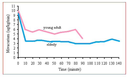 In the elderly, the onset of action and recovery of block of rocuronium are slightly slower than in the young but the potency is similar. The most likely reason for the prolonged duration of action in the elderly is a decrease in renal and hepatic perfusion associated with aging (Figure 3).
