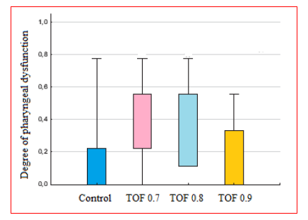 Figure 2 Degree of pharyngeal dysfunction at control and during three levels of partial neuromuscular block TOF ratios 0.70, 0.80, and > 0.90. Severity of pharyngeal dysfunction increased significantly during partial neuromuscular block in the elderly and an increased number of swallows showed multiple abnormalities.