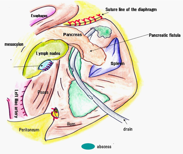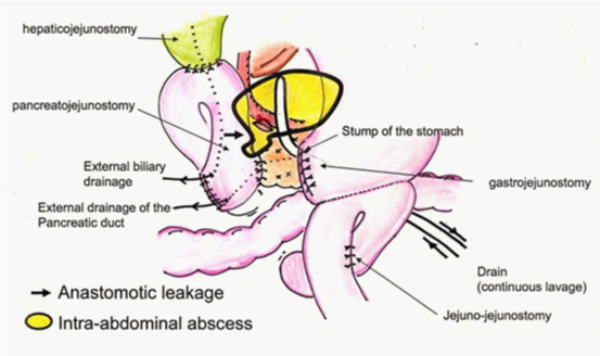 Pancreatic fistule Abdominal abscess(Leakage of the pancrea to gastrostomy and hepatico-jejunostomy) |