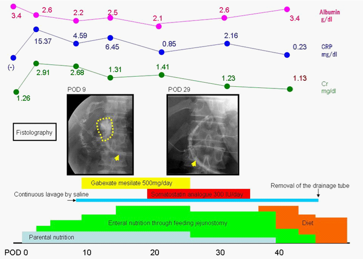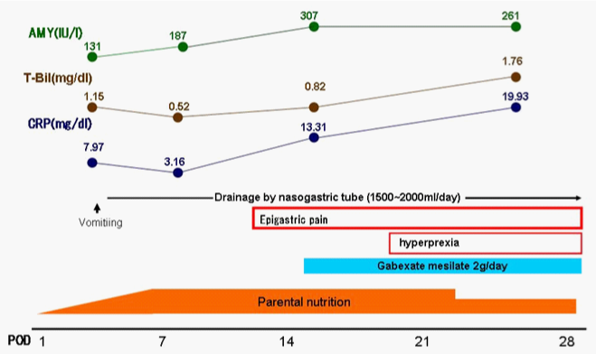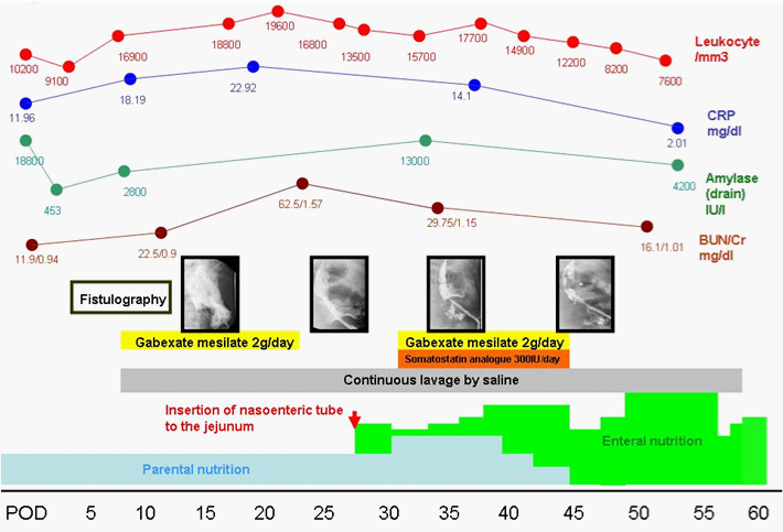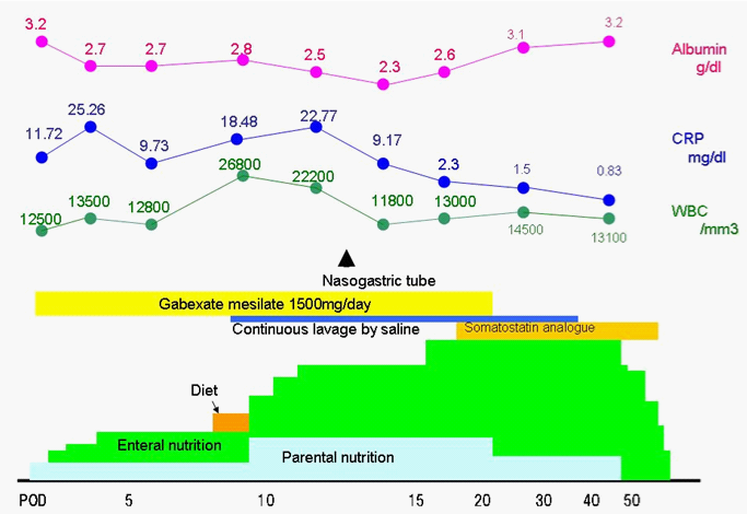 Background: All surgeons should note that complications associated with the pancreas after abdominal surgery can be severe and can induce life-threatening problems such as sepsis, abdominal abscess, and intra-abdominal hemorrhage. In such situations, nutritional management is a key element of therapy to achieve a favorable clinical course.