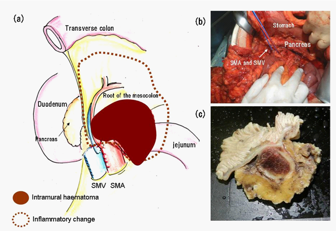 Figure 3 Images and schematic presentations of operative findings and resected specimen in case 2. (a) The intramural haemetoma is localized in the root of the mesentery adjacent to the superior mesenteric vessels with consolidation induced by marked inflammation. (b) An image after segmental duodenectomy. The caudal edge of the pancreas is excised. (c) Cur surface of the resected specimen shows intramural haemetoma localized in the subserosal layer.