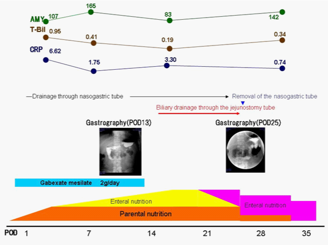 A 74-year-old man underwent pancreatoduodenectomy for inferior bile duct adenocarcinoma. An end-to-side pancreatojejunostomy was performed incorporating the pancreatic duct and the full thickness of the jejunum using interrupted 4-0 synthetic absorbable sutures with an external stent. The outer layer consisted of interrupted 4-0 Maxon sutures placed through the seromuscular layer of the jejunum and through the capsule of the pancreas into the cut edge. An end-to-side hepaticojejunostomy was also fashioned with interrupted 4-0 Maxon sutures. A gastrojejunostomy was performed with an antecolic jejunal loop, and a feeding jejunostomy tube was placed in the upper jejunum distal to the Braun anastomosis. A drainage catheter was placed at the anterior aspect of the pancreatojejunostomy. EN was started on POD 2. The patient pursued a good clinical course during the acute stage after surgery. Oral intake started on POD 7.