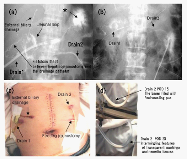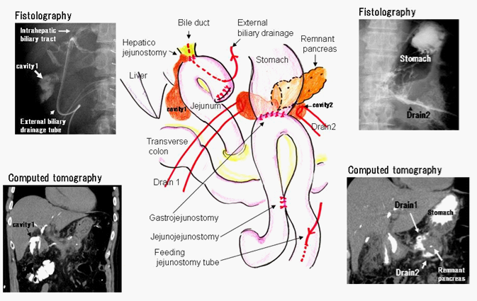 A 60-year-old man underwent pancreatoduodenectomy for duodenal carcinoma. A pancreatogastrostomy, hepaticojejunostomy, and gastrojejunostomy were performed by one surgeon. Because the wall of the common hepatic duct was thin and vulnerable, an external biliary drainage tube was placed through the jejunal loop beyond the hepaticojejunostomy. A percutaneous transperitoneal jejunal feeding tube was placed and passed into the efferent jejunal loop. Occlusive drainage catheters were positioned behind the cranial and caudal edges of the pancreatogastrostomy. Enteral feeding was started 24 hours postoperatively at 20 ml/h. The administration rate was increased daily until the full nutritional goal of 1200 kcal/day was reached on POD 3. On the evening of POD 3, the patient experienced sudden, intense epigastric pain spreading rapidly throughout the right upper quadrant.
