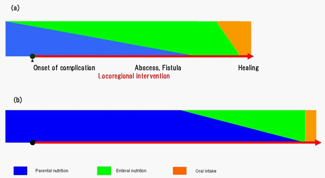 Figure 13 Hypothetical models of postoperative course in cases of complications associated with the pancreas. (a) Earlier initiation of enteral feeding through feeding jejunostomy tube placed intraoperatively is needed to optimize clinical conditions after complications. (b) Delayed initiation of enteral yields prolonged periods of therapy for complications.
