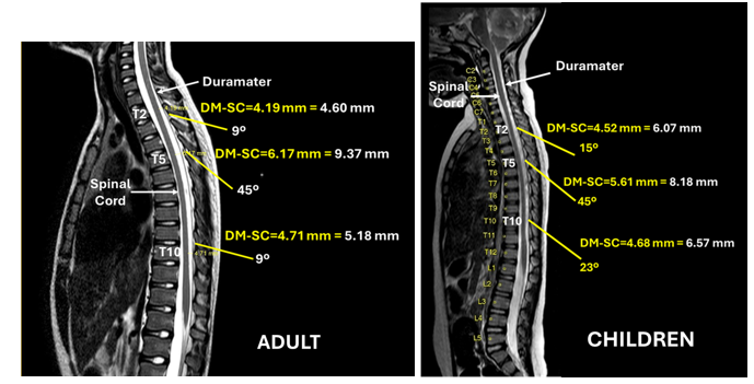 Various imaging tests such as radiography (X-rays), computed tomography (CT), magnetic resonance imaging (MRI), ultrasound (US) and fluoroscopy, each test has its own application and efficiency. MRI is considered the reference test for many spinal conditions and was chosen for the study of the various parts that include skin to the anterior bony structure, in adults and children.23-26 Most MRI studies to assess distances from the skin to the posterior spinal cord are performed in the supine position. We also believe, when we give lateral or sitting position for subarachnoid block, cord will move more anterior due to the effect of gravity, leading to more space for drug installation and less chances of neurological injuries. In an MRI study performed in an adult Indian population, evaluating two thoracic segments (T5, T10) and one lumbar segment (L1), the same maximum space was found at the T5 level, followed by the T10 level.26 The evaluation at the L1 level was justified because most anesthetists who use the seated puncture for subarachnoid access do so one or two spaces above L3.