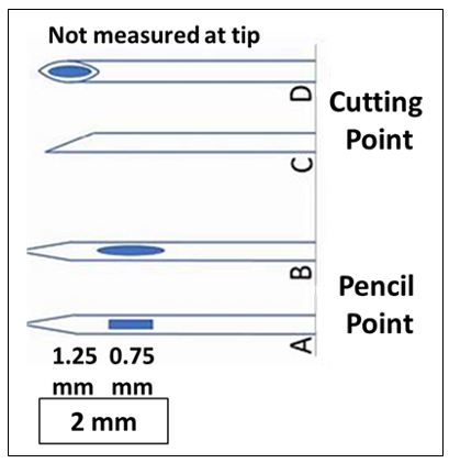 MRI in adults and children aged 0 to 13 years showed the average measurements of the distance between the dura mater and the spinal cord, the entry angles between the skin and the spinal column, and the correction of the distance by the entry angle, showing that there is a smaller distance than the tip of any type of needle for spinal anesthesia (Figure 1). In Letter to the Editor was showed that cut-point needles would be safer for thoracic puncture.27 Pencil-point needles have a lateral orifice that starts at 0.8 mm and ends at only 1.7 mm, so there is a need to penetrate the subarachnoid space 2 mm for CSF to appear, showing that this distance is always smaller than the distance between the dura mater and the spinal cord (Figure 2). A retrospective study with TSA in 1,406 patients showed safety and effectiveness without any neurological sequelae.28