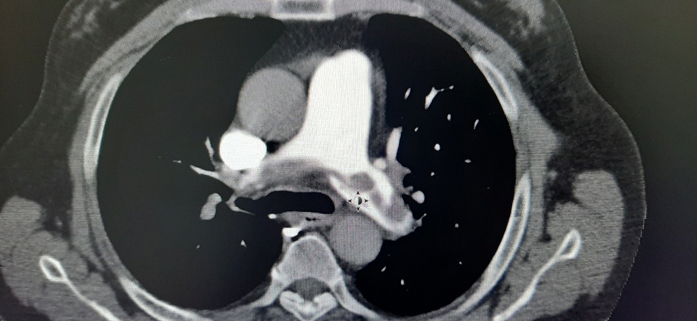 This 60 years old patient was admitted to ER in a state of highly suspected PE however he was in relatively stable condition. The diagnosis of PE was based on history of immobilization as a consequence of knee injury and the clinical picture of shortness of breath and tachycardia. ECG showed S1 Q3 T3 which occurs in 15 % of PE cases reflecting severe right heart strain and cor pulmonale.1 The right heart dilatation was confirmed by transthoracic echo. D-Dimer was significantly high and finally CT pulmonary angiogram (CTPA) demonstrated a large saddle embolus extending to both right and left pulmonary arteries.