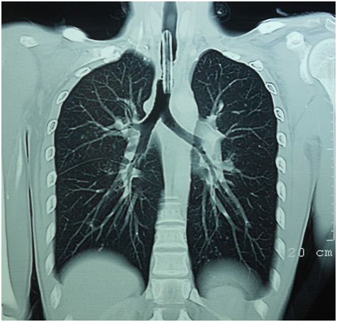 Figure 1 Coronal section of the chest computed tomography scan revealed narrowing of the tracheal lumen well above the carina with tracheostomy tube in situ.