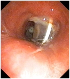 The patient was thoroughly evaluated with computed tomography scan of chest (Figure 1) and video bronchoscopy (Figure 2) and found to have severe tracheal stenosis and therefore, was planned for Tracheal Resection with end-to-end anastomosis under cross-field general anesthesia. The patient was placed supine with extended neck. The procedure was started with a transverse neck incision involving tracheostomy wound. The tracheostomy tube was removed and replaced with a sterile Flexometallic endotracheal (ET) tube with ventilatory circuit by one of the assistant through which general anesthesia was continued. Peristomal dissection was carried out and trachea freed from the skin. Cervical part of the trachea was mobilized. To reach the stenosed segment of trachea, upper median sternotomy was done. The diseased stricture segment was approximately 2cms in length and about 1.5cms from the stoma. The intervening area between the tracheostomy stoma and strictured segment was unhealthy with thinned out tracheal wall. Decision was taken to resect the trachea from proximal to stoma to distal to stenosis including the intervening unhealthy segment which amounted to nearly 4.5cms of tracheal length. In order to achieve adequate length for anastomosis, laryngeal drop was performed by extending the neck and raising the flaps. Trachea was mobilized completely and the diseased segment as described was resected. Airway was established by passing the flexometallic ET tube into the distal tracheal segment. However, adequate length for tension free anastomosis was still not achieved.