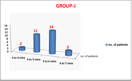 Not a single study is available comparing the TST and jaw thrust for assessment of depth of anaesthesia for LMA insertion in children. Chang et al.14 in adult population compared both the tests and found similar insertion time required in group T (4.1±1.8) as in our study. We found successful PLMA insertion in maximum number of patients between 4-5 minutes in group T while it was 5-6 minutes in group J (15 v/s 14) (Chart 2 and 3). The elapsed time from anesthetic induction to LMA insertion was 4.48±0.6 in group T which was also comparable with the study done by Hooda et al.4 in children and but it was reported to be longer by Chang et al.7 (4-10minutes). It took 4.85±0.71 minutes in group J which was longer than observed by Chang et al.14 in adults (2.1±1.1minutes) which may be because he used 8% of sevoflurane for induction. We used an inspired sevoflurane concentration of 4% instead of 8% to increase the end-tidal sevoflurane concentration more slowly for detection of the precise timing of trapezius reflex or jaw thrust reflex disappearance. The end-tidal sevoflurane concentration in our study was similar in both the groups (3.72±0.2 vol% / 3.7±0.13vol%) which is comparable to study done by Hooda et al.4 & Chang et al.7 where as it was higher (4.1vol%)in adults as observed by Chang et al.14