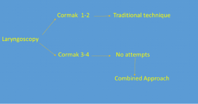 To maintain a workspace clean and free of blood and prevent adverse events during laryngoscopy when a Cormack score of 3-4, logic dictates that we must refrain from blind attempts and go directly to the optical instrument. Do not make any blind attempts and stopping at the seconde step of the procedure laryngoscopy: this is when. But how? Among all available techniques, that with the greatest likelihood of successful intubation must be selected. Approaches using individual instruments (VLS, Air-Traq, Bonfils etc.) have success rates of 97–98%.10‒12 A combined approach using tools that display the glottic region and instruments that also display the trachea allows the tube to be introduced and placed under vision and resolves the majority of difficult cases.13‒16
