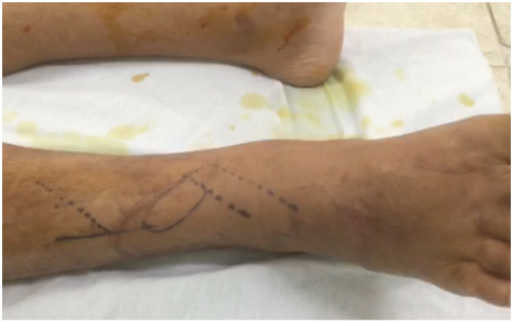 After written consent for publication, a 46-year-old male (height 1.70m, weight 80kg, ASA I) was admitted for tenolisys of anterior compartment of lower leg under spinal anesthesia after an open trauma in traffic accident 1 year ago (Figure 1), indicated for surgical release of the tendon and muscle under anesthesia. Tests revealed all electrolytes normal. Bilirubin, urea, creatinine unchanged. Chest X-ray and ECG were normal.