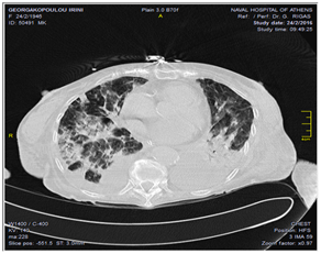 For our surprise she was rapidly fully awake but unable to wean from mechanical ventilation, following our protocol, because she was hemodynamicaly unstable with the need of high doses of norepinephrine. The angiography showed absence of obstructive coronary disease and following Mayo criteria the diagnosis of Takotsubo syndrome was set. We decided then to continue ventilation support in order to minimize the work of breath (tracheostomy) and the use of hemodynamic support (vasoconstriction) as well as checking the heart function by ECHO and the heart rhythm because of ventricular arrhythmias. Markers for tumors or neuromuscular diseases were also send without any findings. A bronchoscopy (P4) for washing-brushing was also done looking for a paraneoplastic tumor. Biopsies of the lung were taken for more investigation in order to prove theory. Nothing of the above proved unless a subclinical LID. 6 weeks later the patient remains connected to the ventilator (PS: 6/PEEP: 4), without vasopressors support and the heart systolic function normal again.