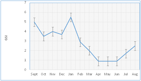 Of 330 ovaries examined, the majority showed advanced maturation stage, being common from August to March; ovaries showing immature/recovering stages were frequent from April to July (Figure 4). In September about 40% of the females showed early spawning stage. Average GSI values increased from August to February peaking at September. Lower values were recorded from April to June (Figure 5). Fulton fish condition showed highest values from September to February and lowest in June (Figure 6).