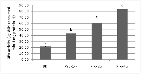 Figure 2 GPx enzyme activity of marron tissue muscle fed basal and probiotic diets at various duration (week). Different letters over bars indicates significantly different at 0.05.
