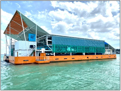 The patented Eco-Ark® as shown in Figure 118 is deployed in Singapore waters off Pulau Ubin. The existing Novel Offshore Advanced Hull System (NOAHS) Eco-Ark® has four large tanks of 500m3 and is about the size of an Olympic swimming pool. It has the capacity to produce 166,000kg of barramundi fish annually, and enables sustainable farming out at sea in volumes that are 20 times more than average minimum production levels at traditional coastal farms. This integrated floating platform uses offshore and marine technology, IOT and the influent sea water is filtered and ozonated to oceanic fresh water to cultivate the fish. It has a flow-through water supply system which cleans the water before discharging it safely and responsibly back to the sea. It can be switched to recirculation mode when needed. These technologies mitigate the effects of spread of waste to the sea and algae blooms that threaten both the farm and our sea and offshore sites. She has a roof equipped with BIPV solar panels to supply electricity for the fish farm. She has an upper deck for larviculture and post-harvest work allowing the harvest to be cleaned, processed and vacuum pack for fresh same day distribution. This is to transform fish farming practices to be more productive, use less sea space, shorten the unbroken cold chain, be sustainable and be climate-resilient.