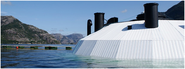 The Egg is being developed by Hauge Aqua which is a company in Norway. It is a fully enclosed egg like structure, made out of composite sandwich that is submerged for 90%. Water is pumped from below the structure via inlet tubes. The water is treated before it enters and leaves the tank.