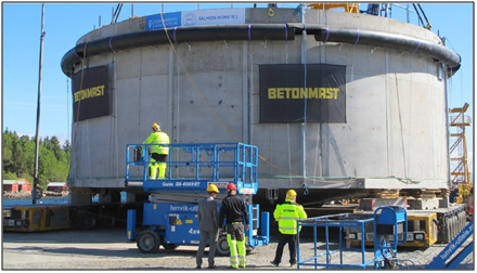 The concept of a bucket named as Salmon Home #1, as shown in Figure 4,20 is owned by Fish Farming Innovations. This rigid cylindrical FCCS is made from reinforced concrete. It has a tapered bottom. The bucket is the first concrete floating fish farm. The construction consists of steel fibre reinforced concrete on the outside and Styrofoam on the inside to provide buoyancy. The outer ring at the bottom has integrated pretensioned cables to withstand the buoyancy forces working on the bottom of the tank when it floats with less water inside than outside. Near the water surface, a PE pipe is installed for extra buoyancy and stability. The total internal water volume is 1000m3.